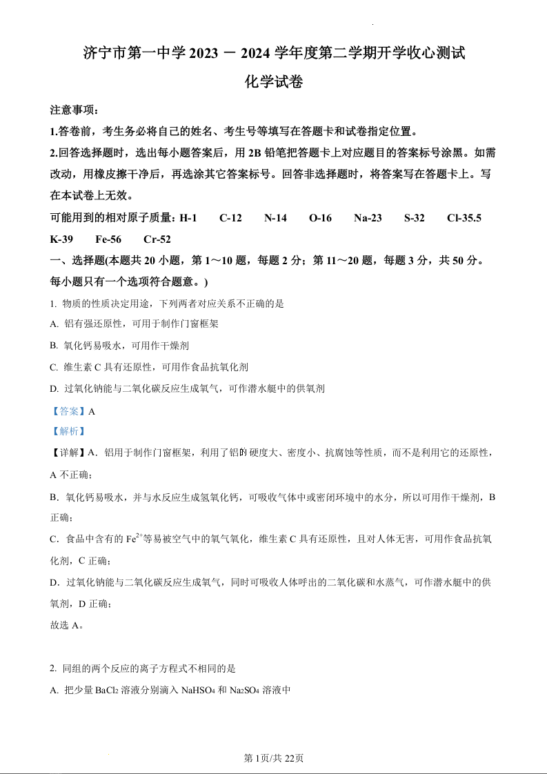 山东省济宁市第一中学2023-2024学年高一下学期开学考试化学(精品解析版)