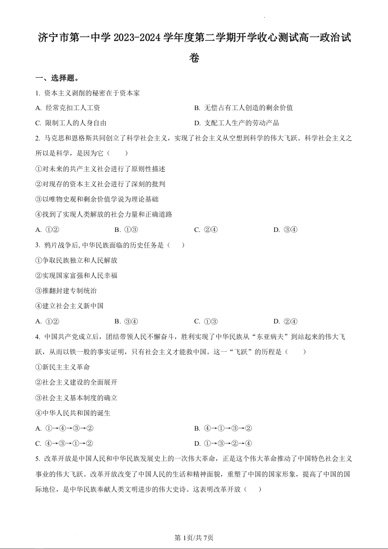 山东省济宁市第一中学2023-2024学年高一下学期开学考试政治(原卷版)