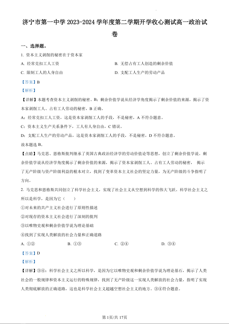 山东省济宁市第一中学2023-2024学年高一下学期开学考试政治(精品解析版)