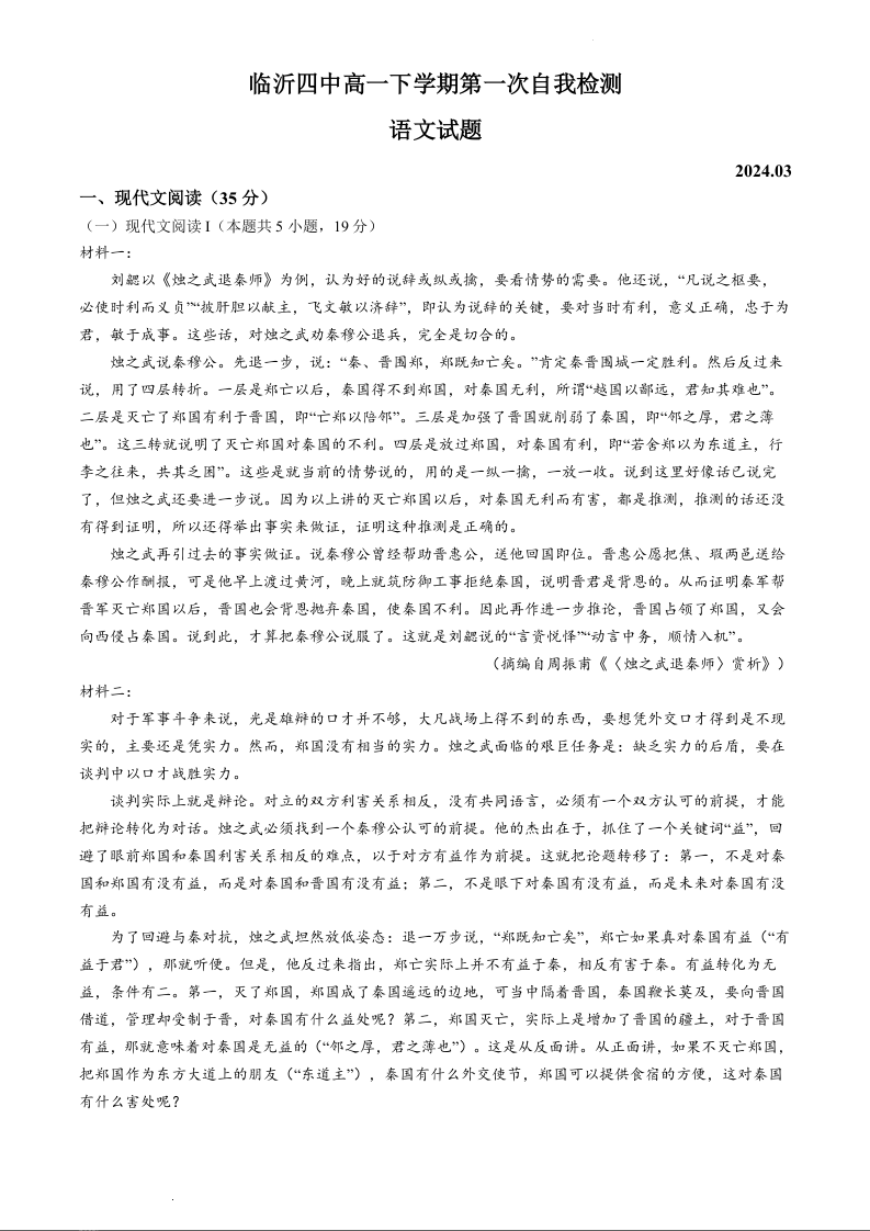 山东省临沂第四中学2023-2024学年高一下学期3月月考语文