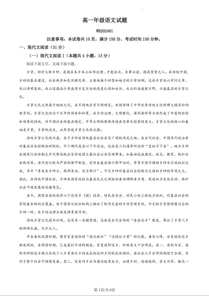 陕西省宝鸡市渭滨区2023-2024学年高一上学期期末考试语文(原卷版)