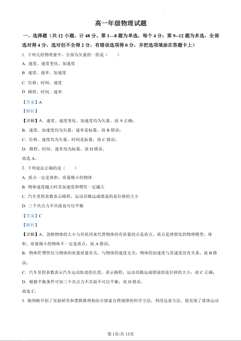 陕西省宝鸡市渭滨区2023-2024学年高一上学期期末考试物理(精品解析版)