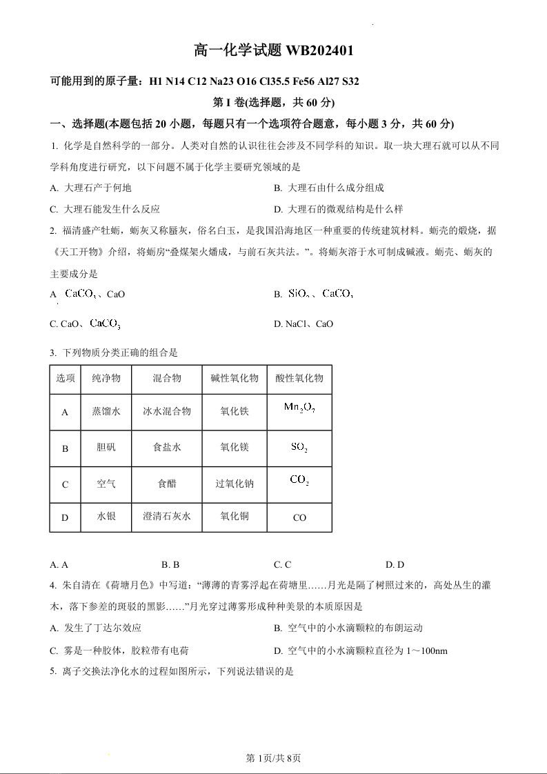 陕西省宝鸡市渭滨区2023-2024学年高一上学期期末考试化学(原卷版)