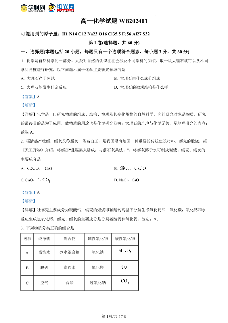 陕西省宝鸡市渭滨区2023-2024学年高一上学期期末考试化学(精品解析版)