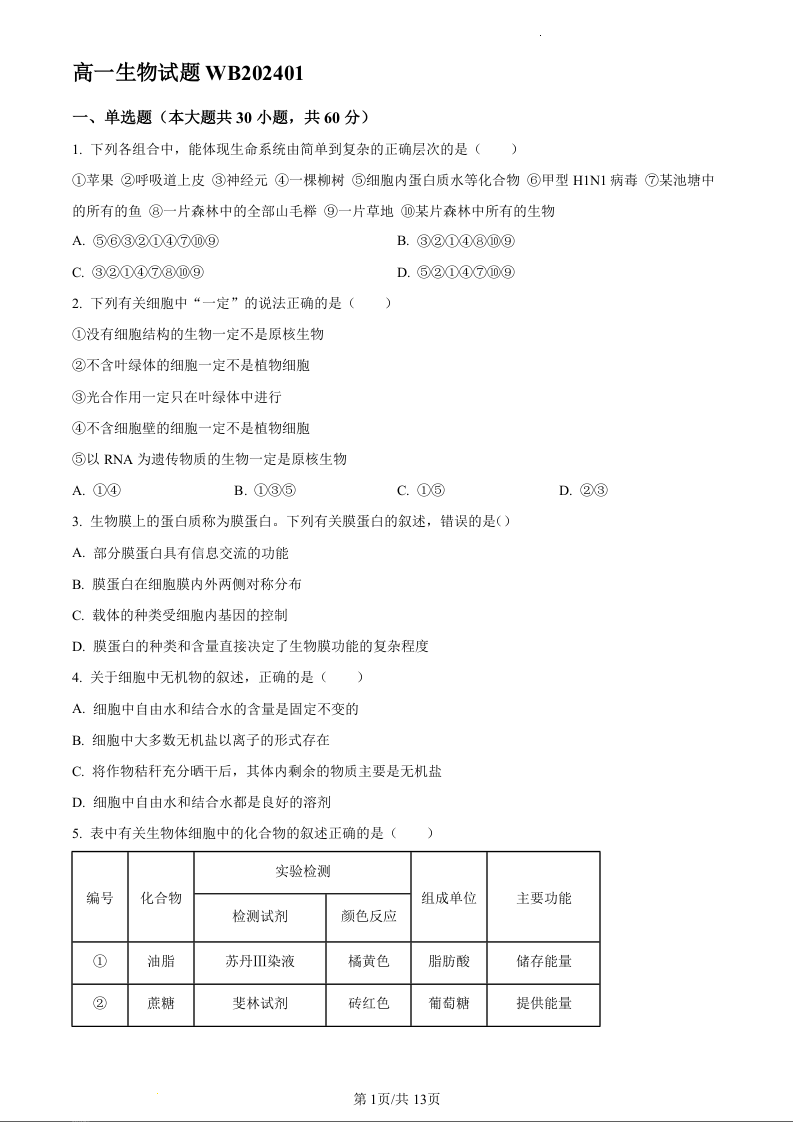 陕西省宝鸡市渭滨区2023-2024学年高一上学期期末考试生物(原卷版)