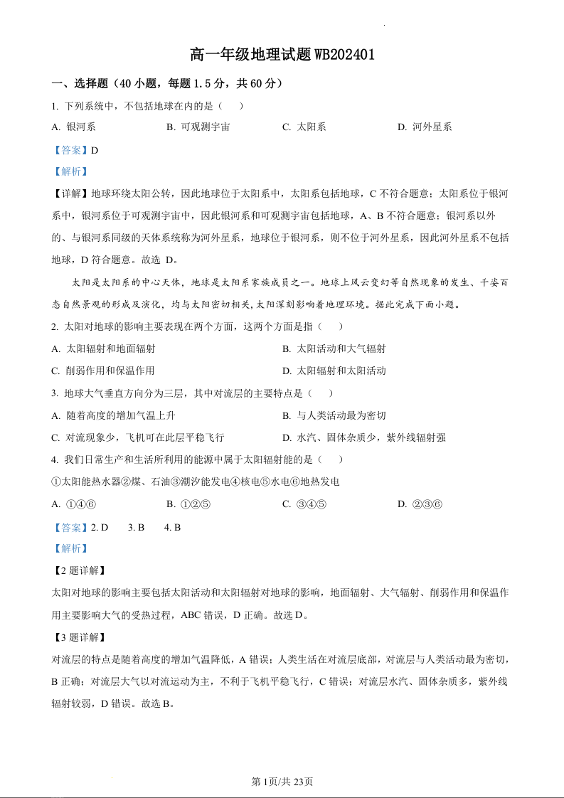 陕西省宝鸡市渭滨区2023-2024学年高一上学期期末考试地理(精品解析版)