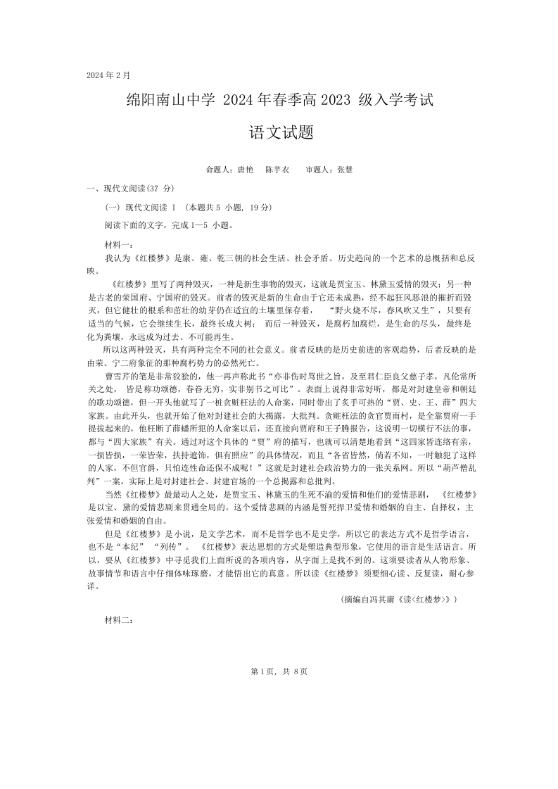 四川省绵阳市南山中学2023—2024学年高一下学期入学考试语文