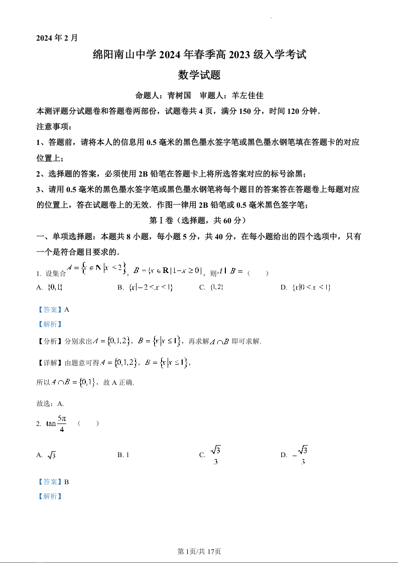 四川省绵阳市南山中学2023—2024学年高一下学期入学考试数学(精品解析版)