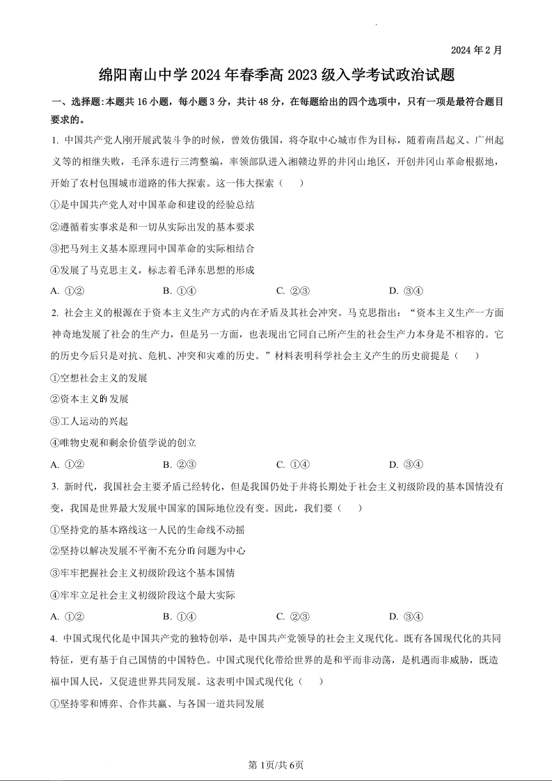 四川省绵阳市南山中学2023—2024学年高一下学期入学考试政治(原卷版)
