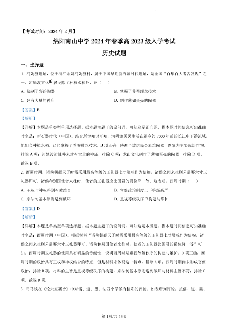 四川省绵阳市南山中学2023—2024学年高一下学期入学考试历史(精品解析版)