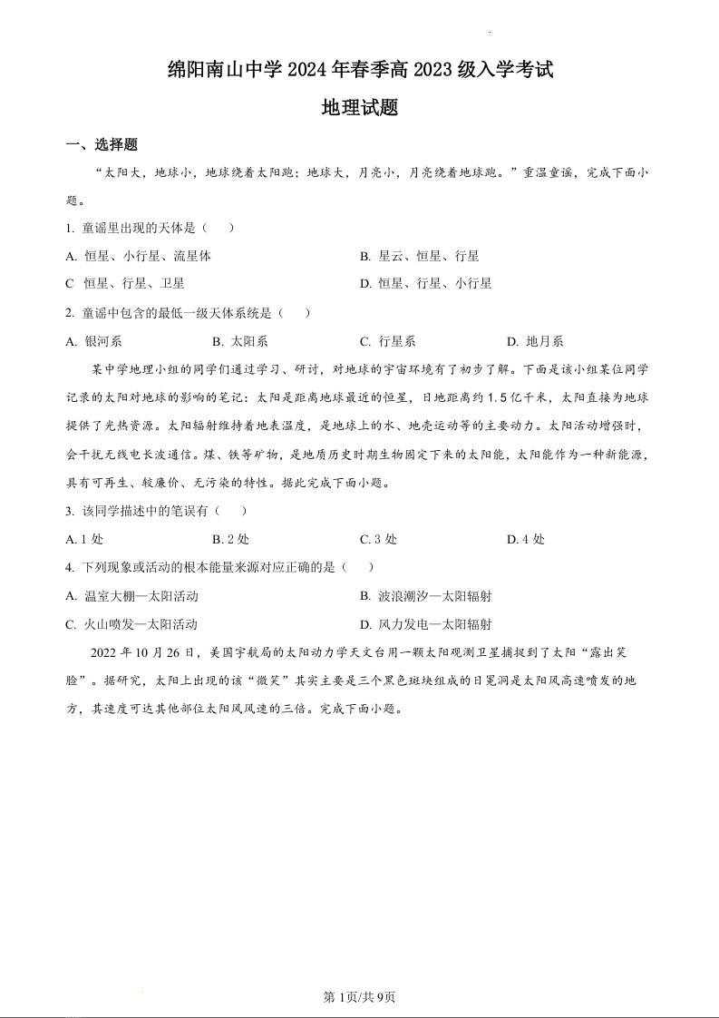 四川省绵阳市南山中学2023—2024学年高一下学期入学考试地理(原卷版)