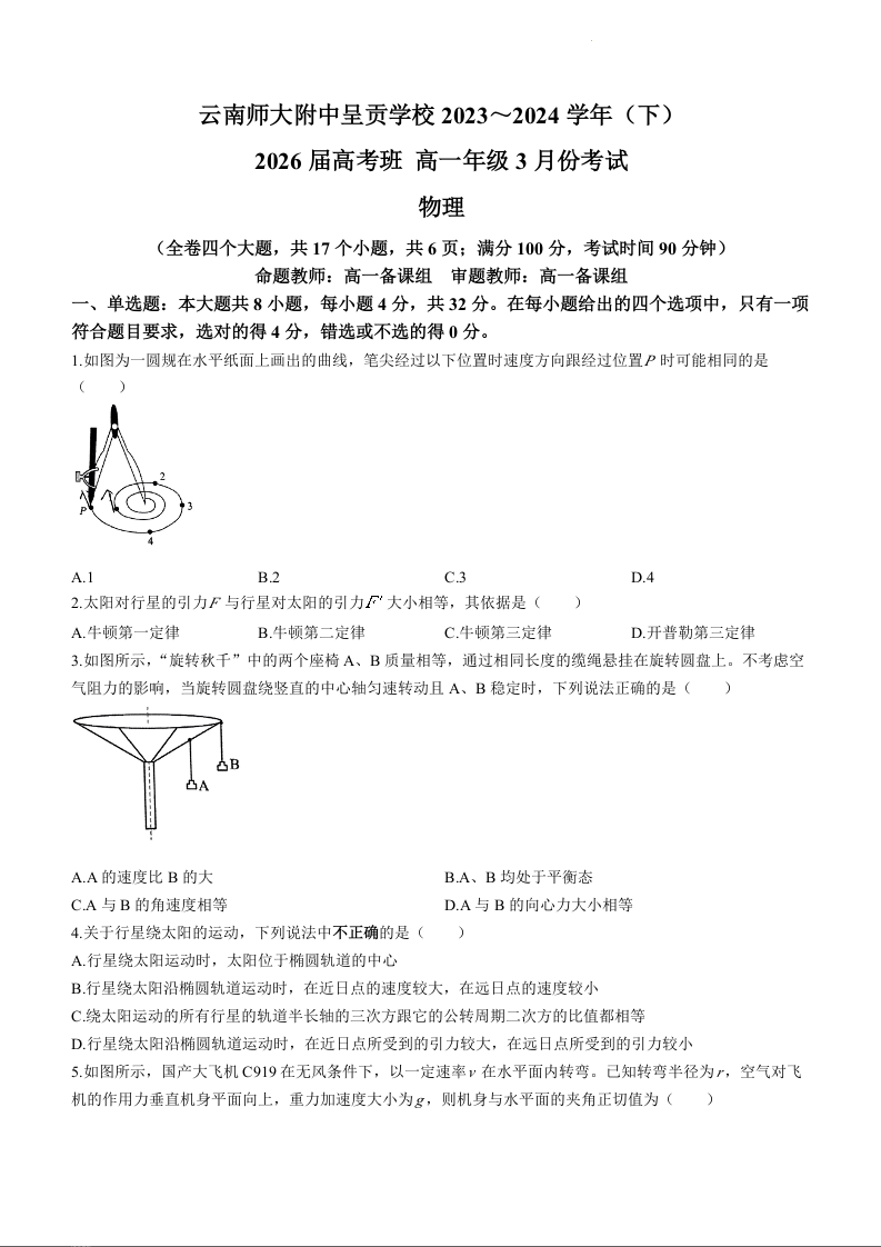云南省师范大学附属中学2023-2024学年高一下学期3月月考物理+答案