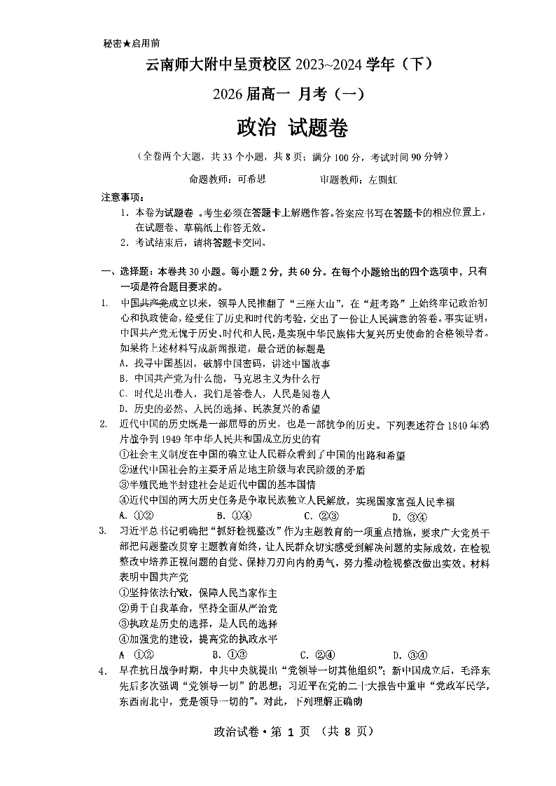 云南省师范大学附属中学2023-2024学年高一下学期3月月考政治
