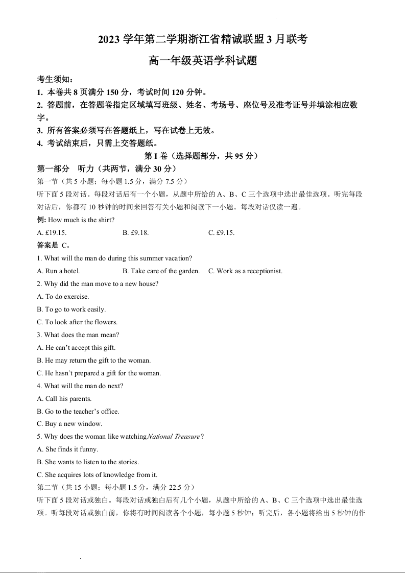 浙江省精诚联盟2023-2024学年高一下学期3月月考英语+答案