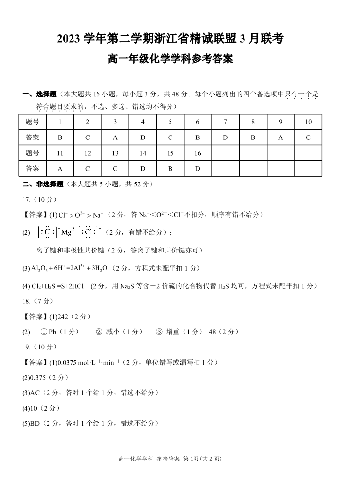 浙江省精诚联盟2023-2024学年高一下学期3月月考化学答案