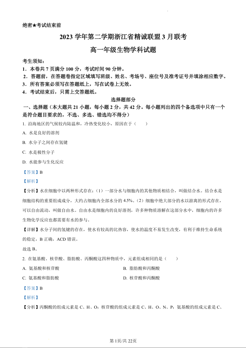 浙江省精诚联盟2023-2024学年高一下学期3月月考生物(精品解析版)