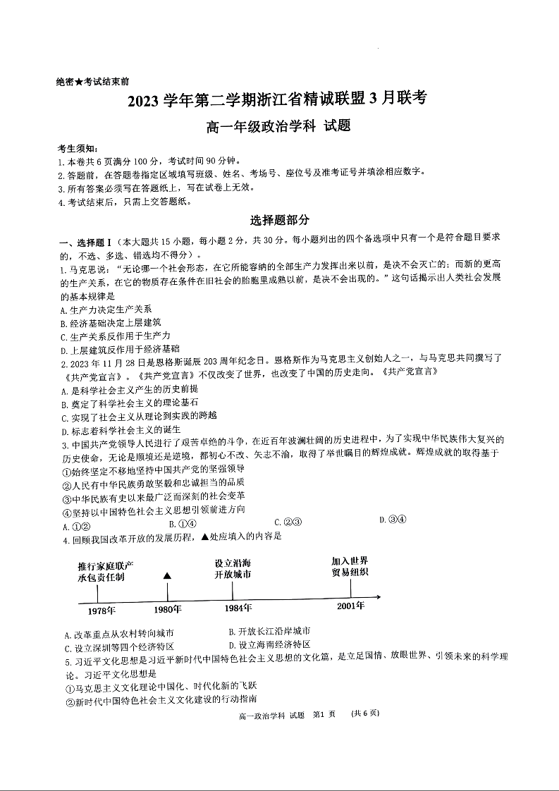 浙江省精诚联盟2023-2024学年高一下学期3月月考政治