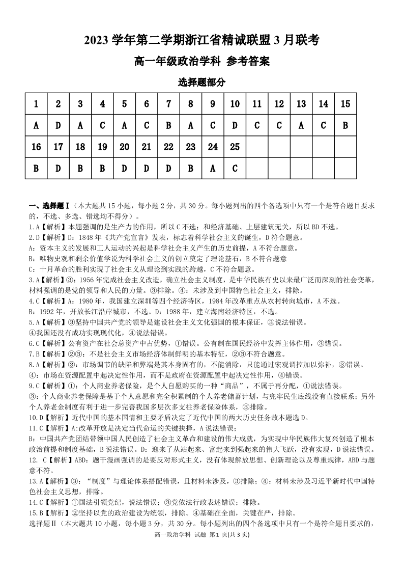 浙江省精诚联盟2023-2024学年高一下学期3月月考政治答案