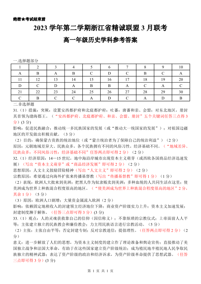 浙江省精诚联盟2023-2024学年高一下学期3月月考历史答案