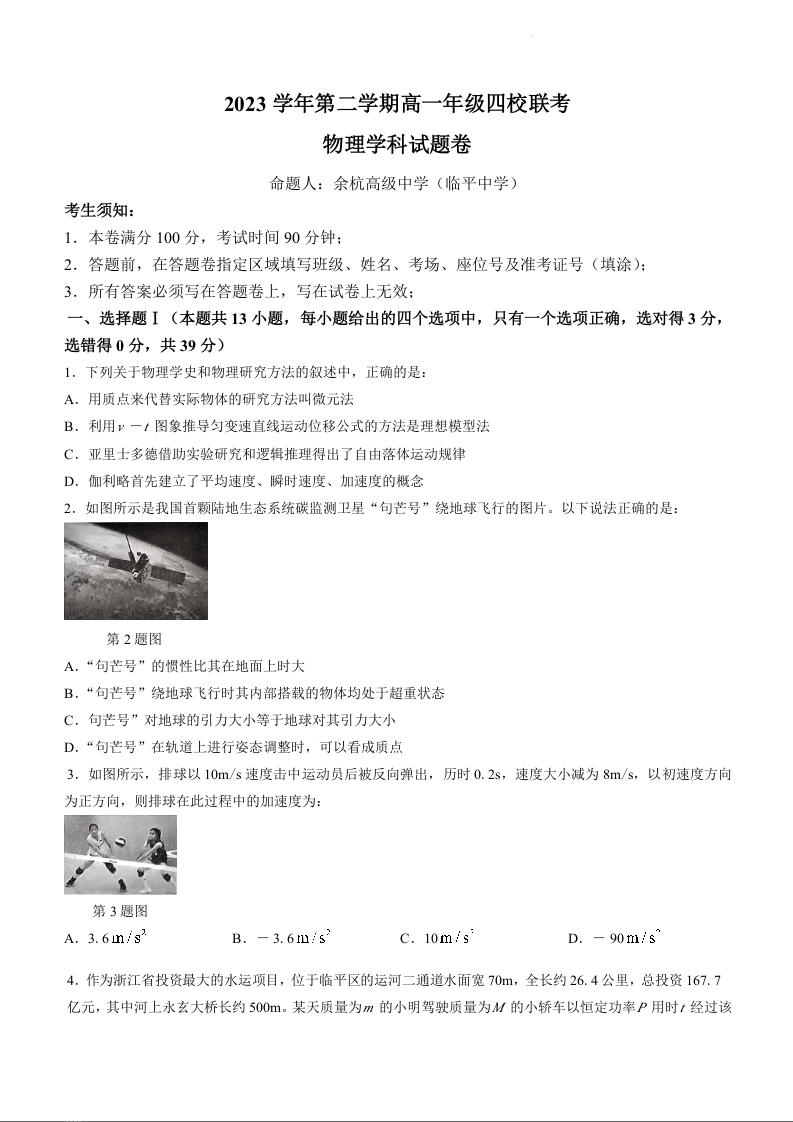 浙江省四校2023-2024学年高一下学期3月联考物理