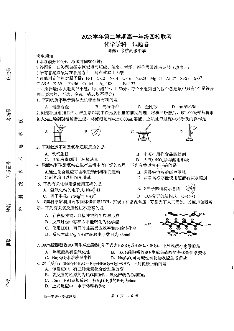 浙江省四校2023-2024学年高一下学期3月联考化学