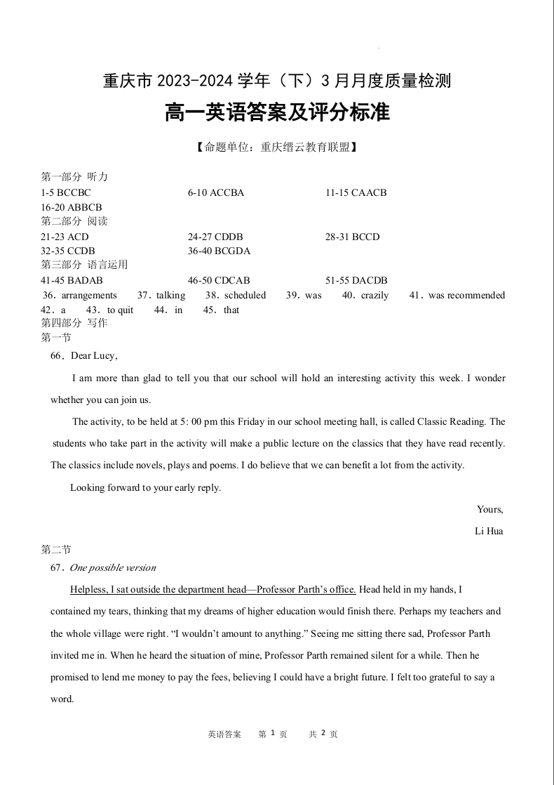 重庆市2023-2024学年高一下学期3月月考英语答案
