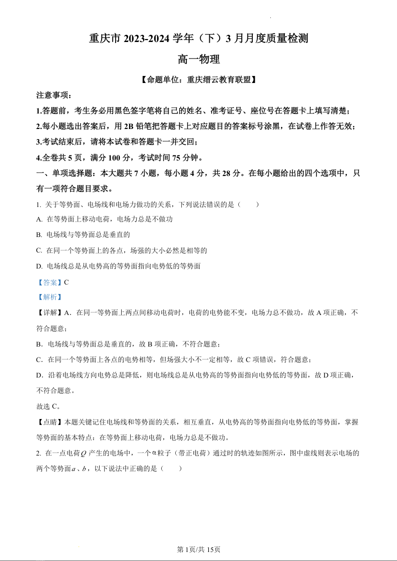 重庆市2023-2024学年高一下学期3月月考物理(精品解析版)