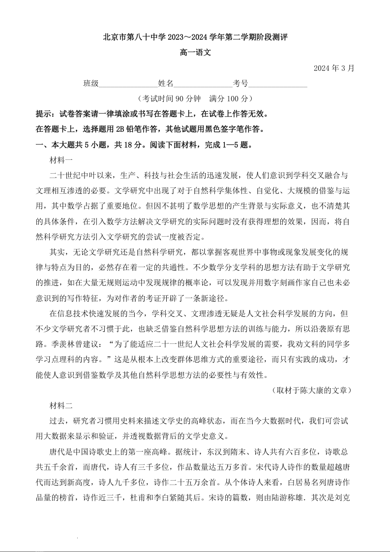 北京市第八十中学2023—2024学年高一下学期3月月考语文+答案