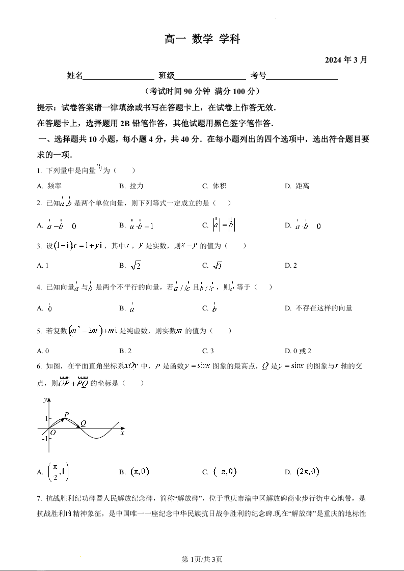 北京市第八十中学2023—2024学年高一下学期3月月考数学(原卷版)