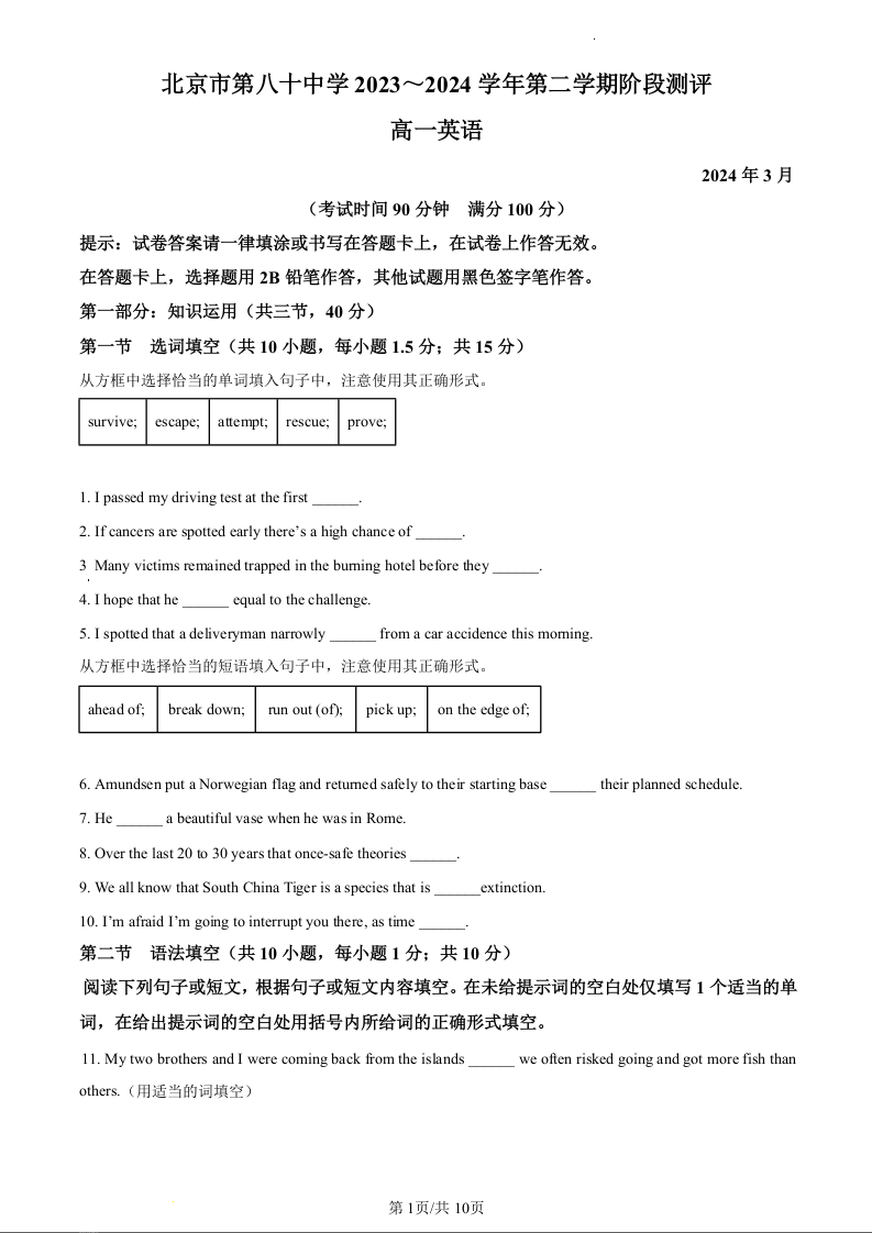 北京市第八十中学2023—2024学年高一下学期3月月考英语(原卷版)