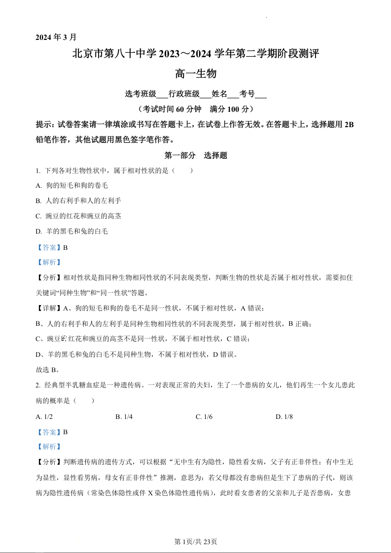 北京市第八十中学2023—2024学年高一下学期3月月考生物(精品解析版)