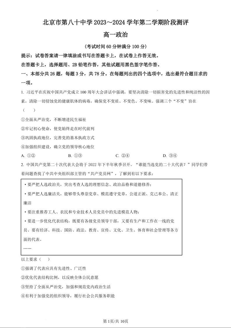北京市第八十中学2023—2024学年高一下学期3月月考政治(原卷版)
