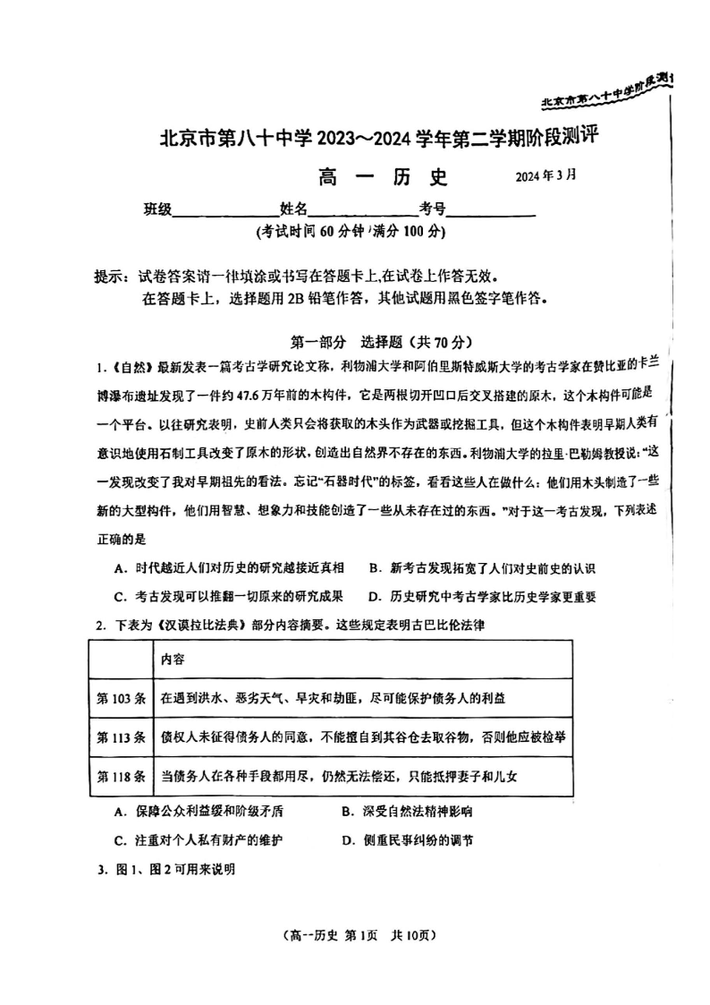 北京市第八十中学2023—2024学年高一下学期3月月考历史