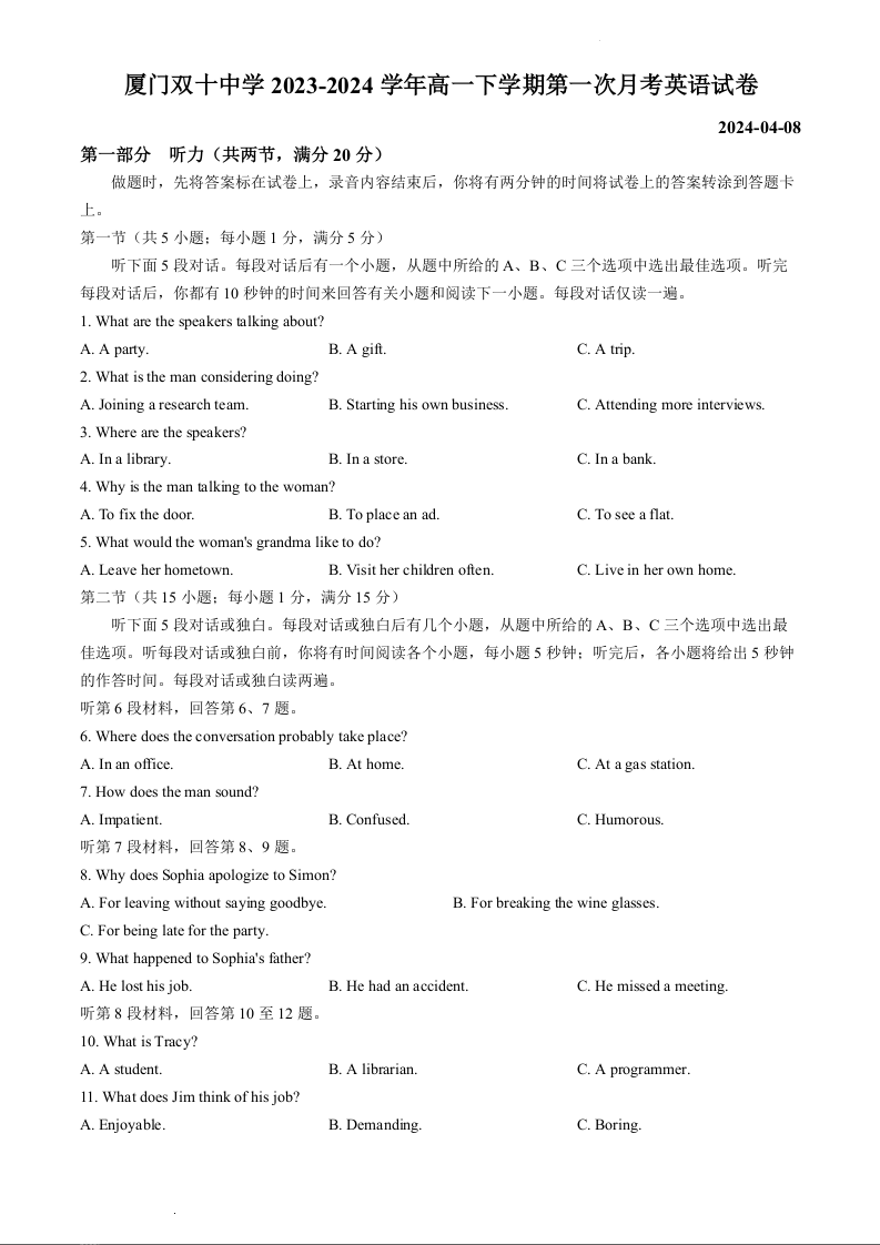 福建省厦门双十中学2023-2024学年高一下学期4月月考英语+答案