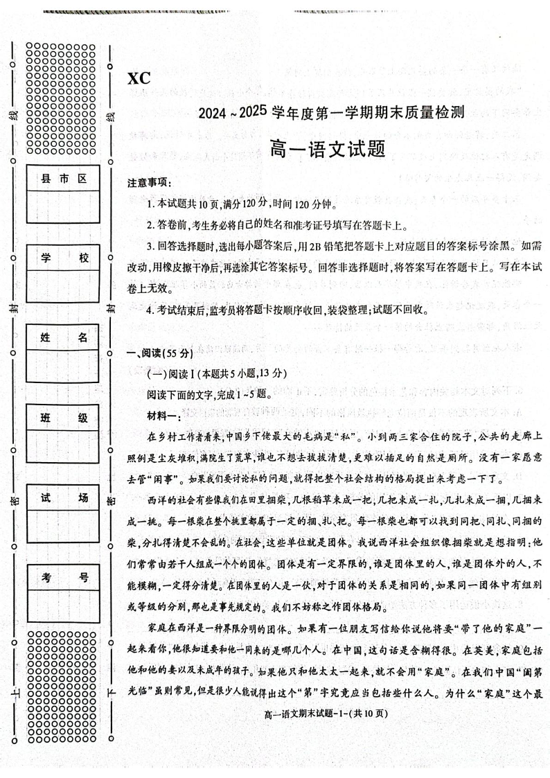 陕西省西安市新城区2024-2025学年上学期1月高一期末考试语文+答案