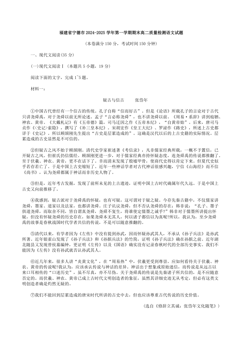 福建省宁德市2024-2025学年上学期1月高二期末考试语文+答案
