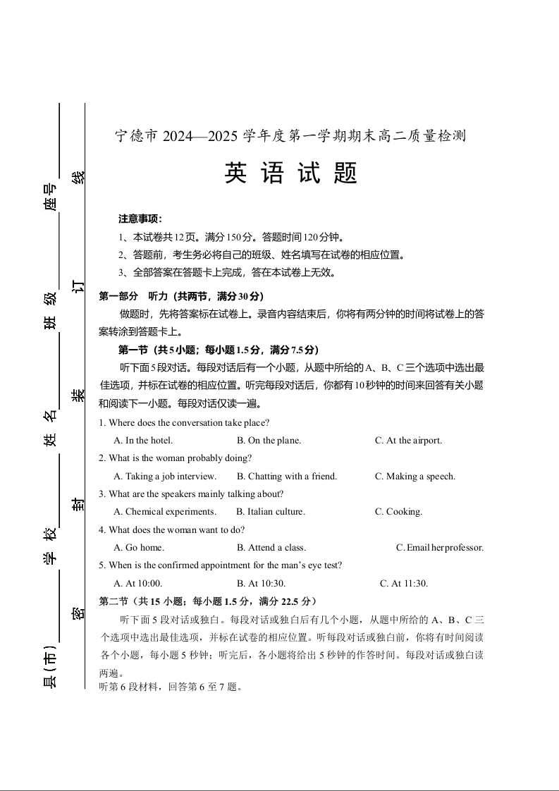 福建省宁德市2024-2025学年上学期1月高二期末考试英语