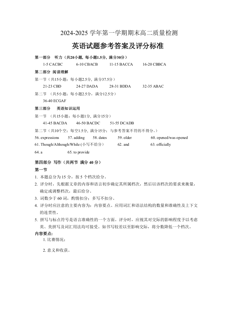 福建省宁德市2024-2025学年上学期1月高二期末考试英语答案