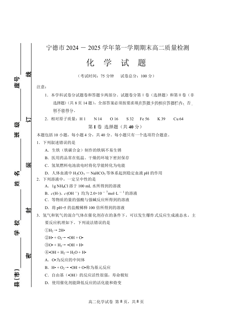 福建省宁德市2024-2025学年上学期1月高二期末考试化学+答案