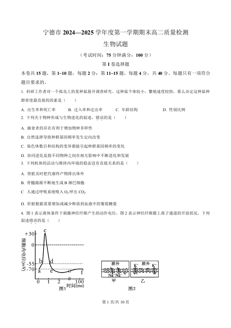 福建省宁德市2024-2025学年上学期1月高二期末考试生物+答案