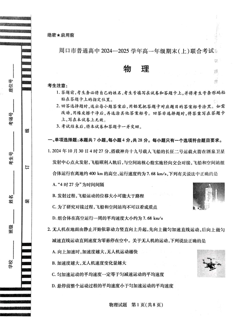 河南省周口市2024-2025学年上学期1月高一期末考试物理+答案