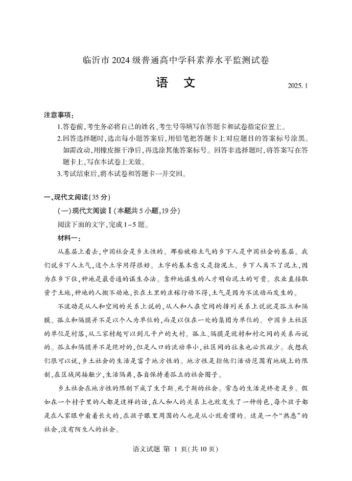 山东省临沂市2024-2025学年上学期1月高一期末考试语文+答案