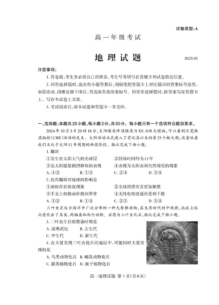 山东省泰安市2024-2025学年上学期1月高一期末考试地理+答案