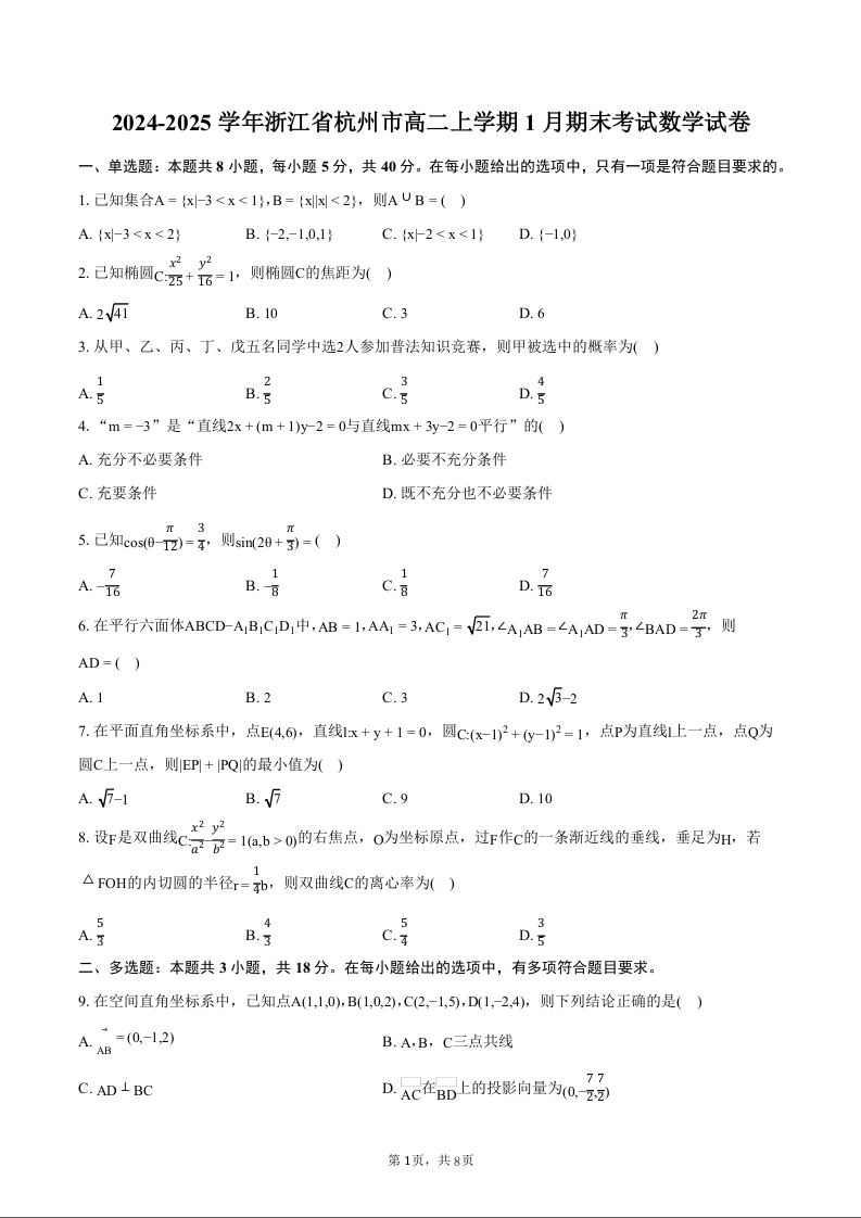 浙江省杭州市2024-2025学年上学期1月高二期末考试数学+答案