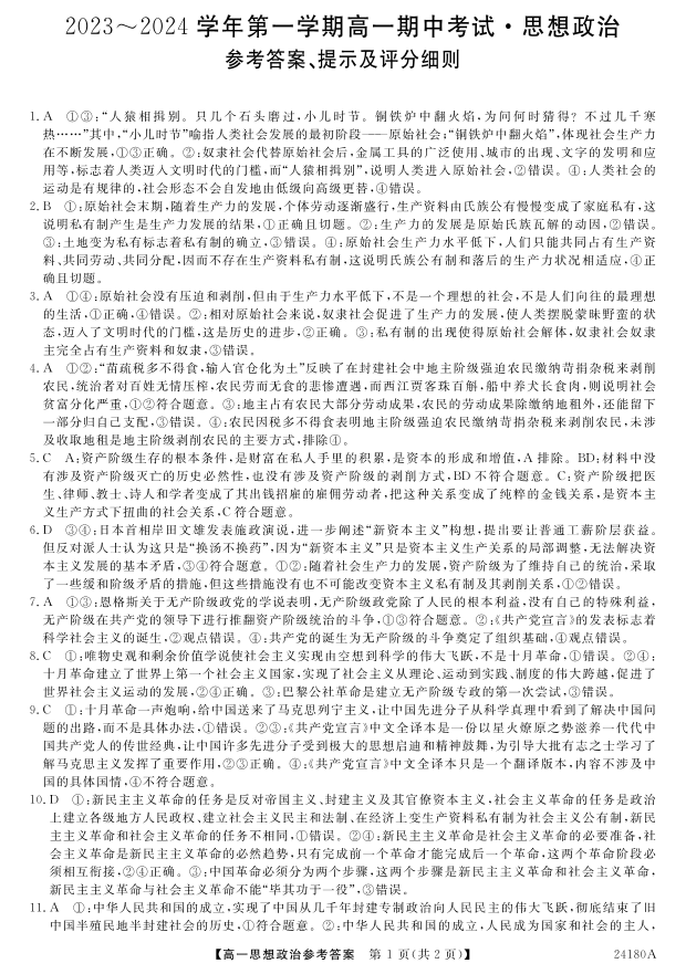 甘肃省武威市天祝一中、民勤一中、古浪一中等四校2023-2024学年高一上学期期中联考政治答案