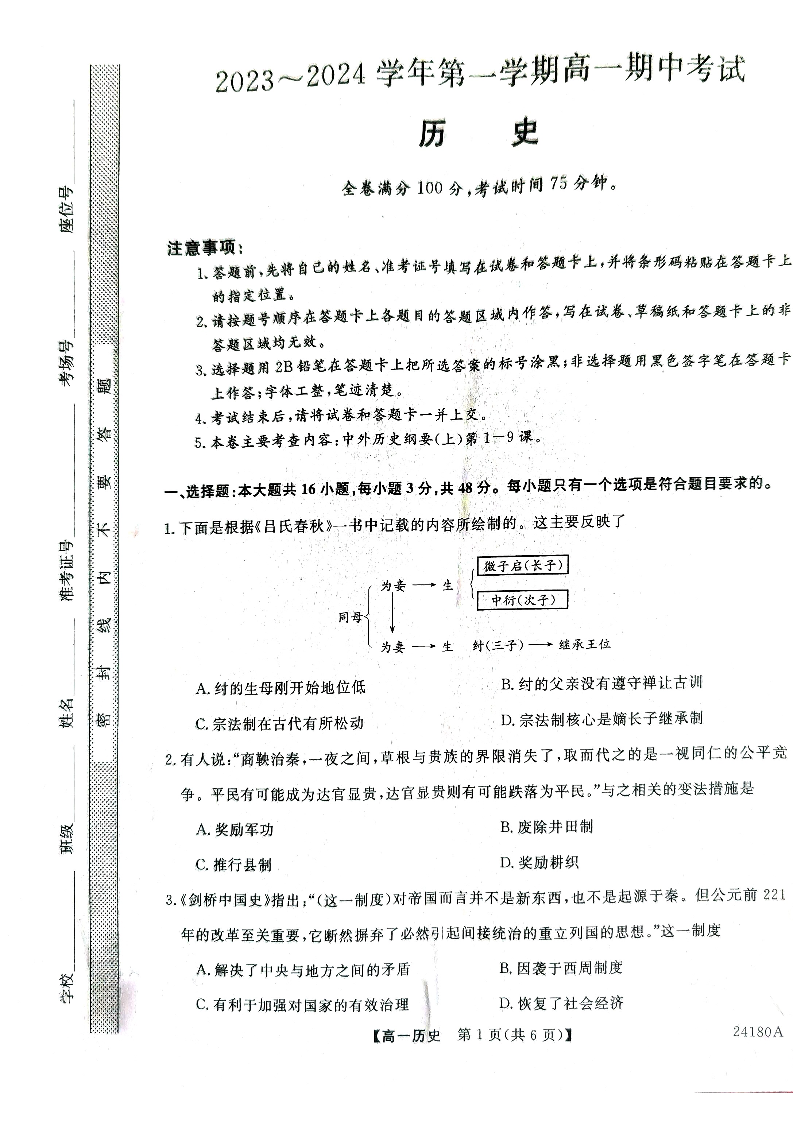 甘肃省武威市天祝一中、民勤一中、古浪一中等四校2023-2024学年高一上学期期中联考历史