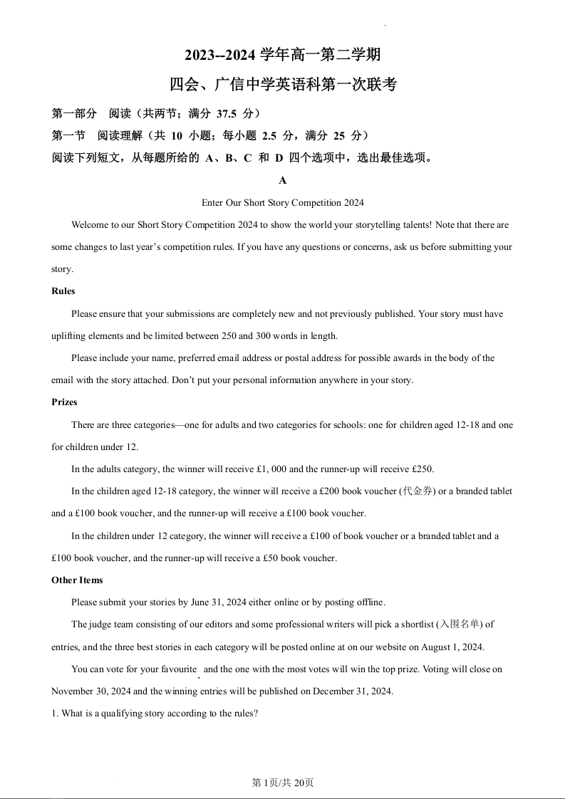 广东省四会中学、广信中学2023-2024学年高一下学期第一次月考英语(精品解析版)