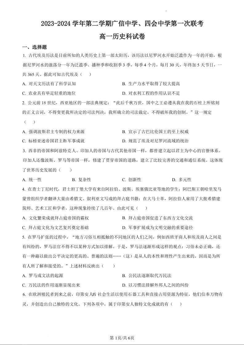 广东省四会中学、广信中学2023-2024学年高一下学期第一次月考历史(原卷版)