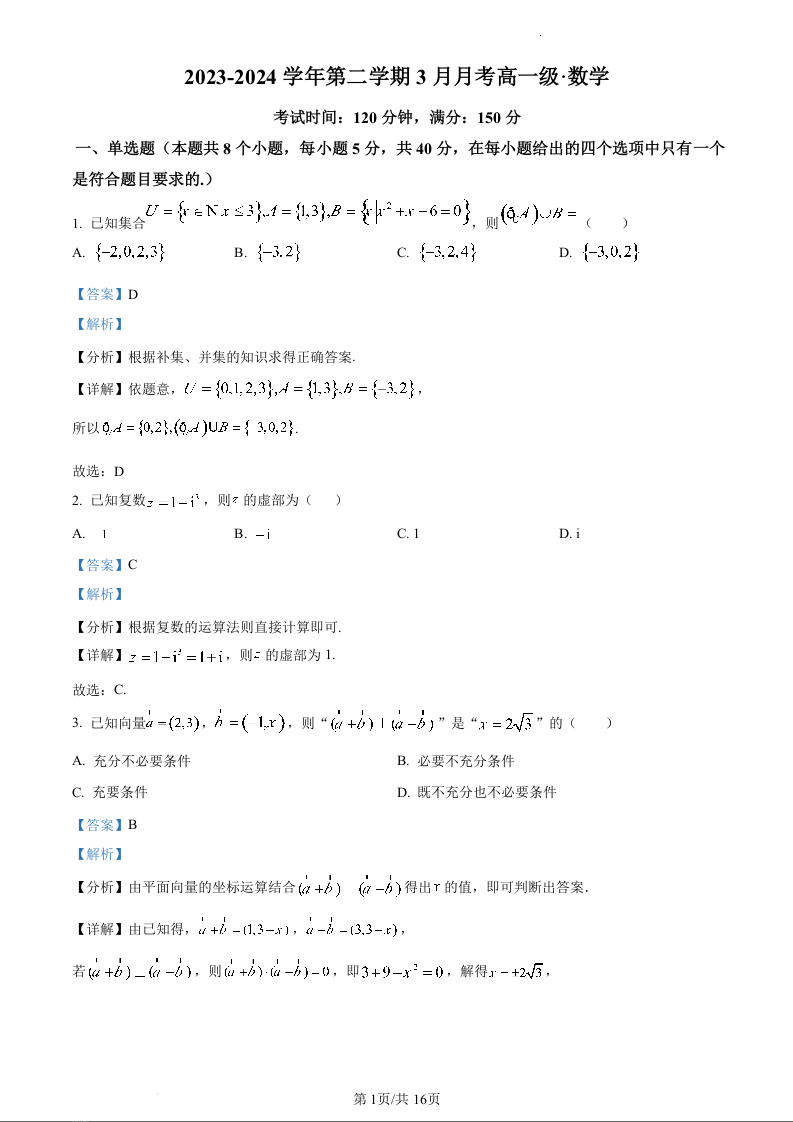 广东省湛江市第二十一中学2023-2024学年高一下学期第一次月考数学(精品解析版)