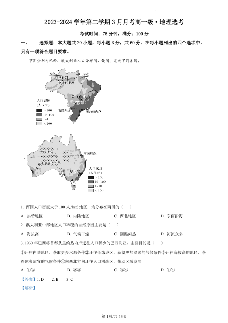 广东省湛江市第二十一中学2023-2024学年高一下学期第一次月考地理(精品解析版)